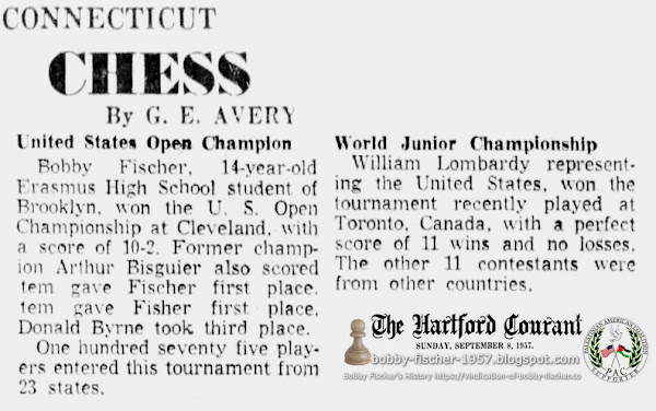 Bobby Fischer, 14-year-old Erasmus High School student of Brooklyn, won the U.S. Open Championship at Cleveland, with a score of 10-2. Former champion Arthur Bisguier also scored [illegible: ommitted text] gave Fischer first place. Donald Byrne took third place.